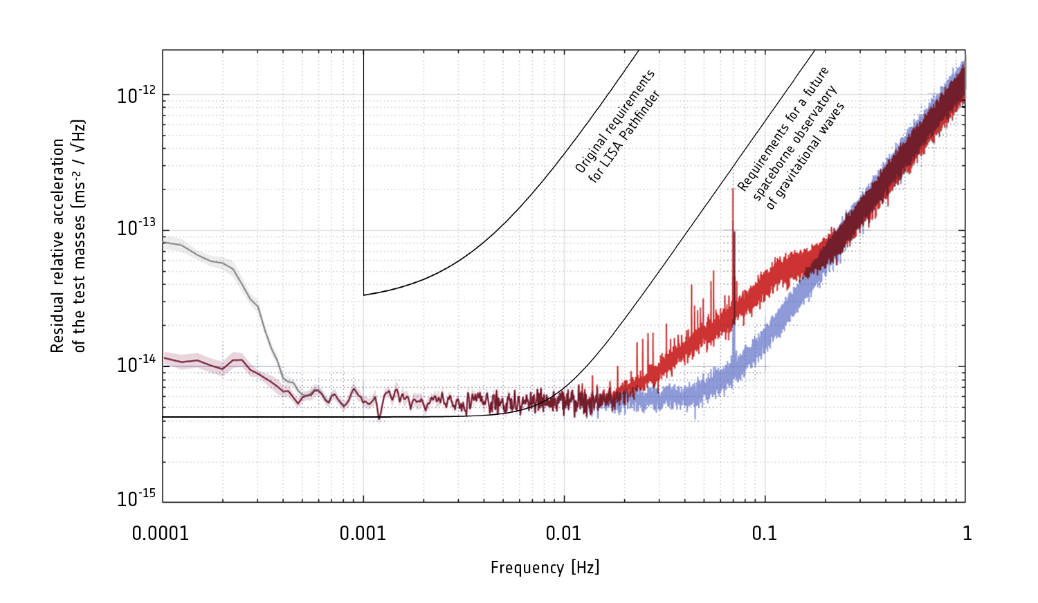 The grey, red and blue curves are based on the measurements performed with LISA Pathfinder, which achieved a precision more than five times better than originally required.